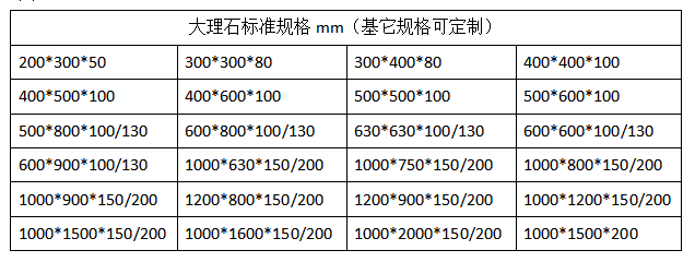 大理石平臺在工廠檢驗、測量,實驗室實驗等方面都適用,大理石平臺一般規(guī)格從200*200到2000*4000mm不等,我們有自己的標(biāo)準(zhǔn)規(guī)格(見圖1)。有時候客戶需要的尺寸并不是標(biāo)準(zhǔn)規(guī)格,就需要定制,這時候會有客戶考慮說定制大理石平臺是不是比標(biāo)準(zhǔn)的價格高,其實并不是這樣的。大理石平臺的加工是先采用鋸床切割出適合的尺寸,然后經(jīng)過人工研磨制成的。不管是標(biāo)準(zhǔn)規(guī)格還是定制規(guī)格,它們的加工工序都是一樣的,像不需要打孔開溝槽的大理石平臺,石料我們是按方算的,而人工研磨的費用是按平方算,所以定制的大理石平臺價格并不高。如果是定制打孔的大理石平臺,那價格就會用變化了,這時候就需要按孔的大小,孔位精度的要求,還要孔的數(shù)量來核算價格。還有一點就是材質(zhì)的選擇,如果要定制濟南青材質(zhì)的大理石平臺,那價格就要按濟南青石料來算價格。